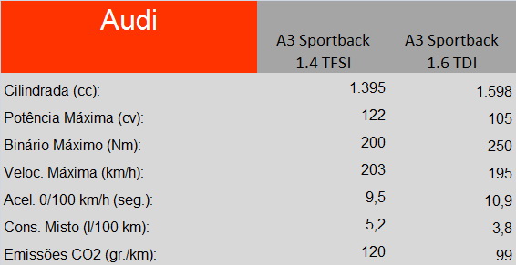 Na fase de lançamento, o A3 Sportback oferece dois motores a gasolina (1.4 e 1.8 TFSI de 122 e 180 cavalos) e dois blocos diesel (1.6 e 2.0 TDI com 105 e 150 cavalos). Em relação a preços, o 1.6 TDI que em Portugal deverá ser o alvo das atenções, devido à aberrante politica fiscal, arranca nos € 28.340, enquanto o 1.4 TFSI está disponível a partir dos € 27.940. Todos os modelos contam com 4 anos de garantia ou 80.000 km.